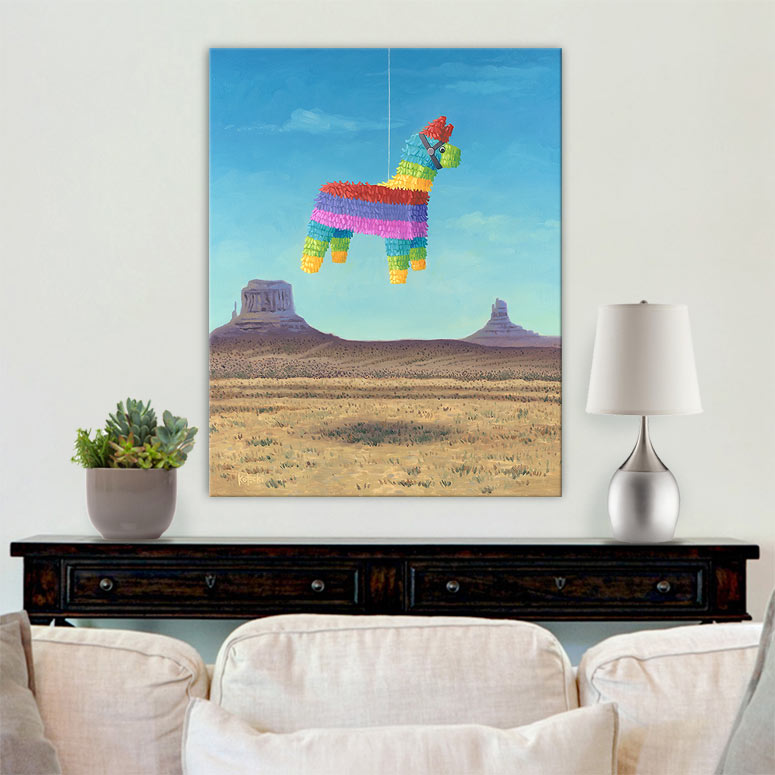 The idea behind this painting is that if you’ve got a piñata, you’ve got a party, even if you’re in the middle of a barren wasteland. We may be drawn in by the bright colors, but the thing that makes a piñata so irresistible is what’s inside.