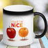 This color changing coffee mug has a black matte finish when it's empty, but when it comes into contact with a hot beverage, it reveals a light-hearted design representing this important reminder.