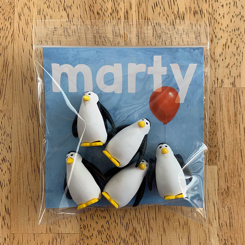 - Each set contains 5 Marty the Penguin erasers and instructions about how to play.